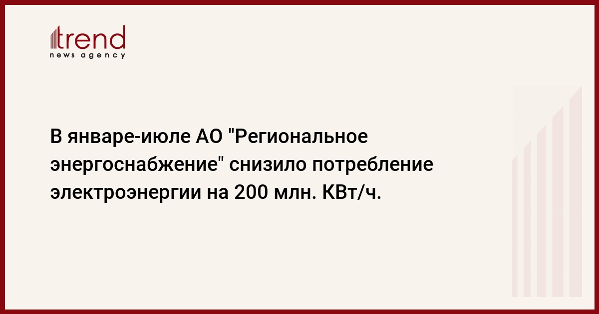 Азербайджан, Баку, 27 августа / Trend / В январе-июле предприятие АО "Азерэнержи" - "Региональное энергоснабжение" потребило 3,1 млрд. КВт/ч. электроэнергии против 3,3 млрд. за аналогичный период прошлого года, говорится в сообщении, распространенном АО в среду.