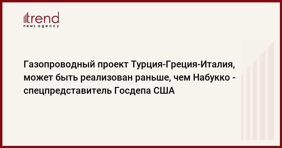 Говоря о трубопроводе Набукко, который является одним из маршрутов транспортировки каспийского газа в Европу, Грей сказал, что газопровод находится в центре внимания, однако возможно, что проект Турция-Греция-Италия будет реализован раньше, чем Набукко.