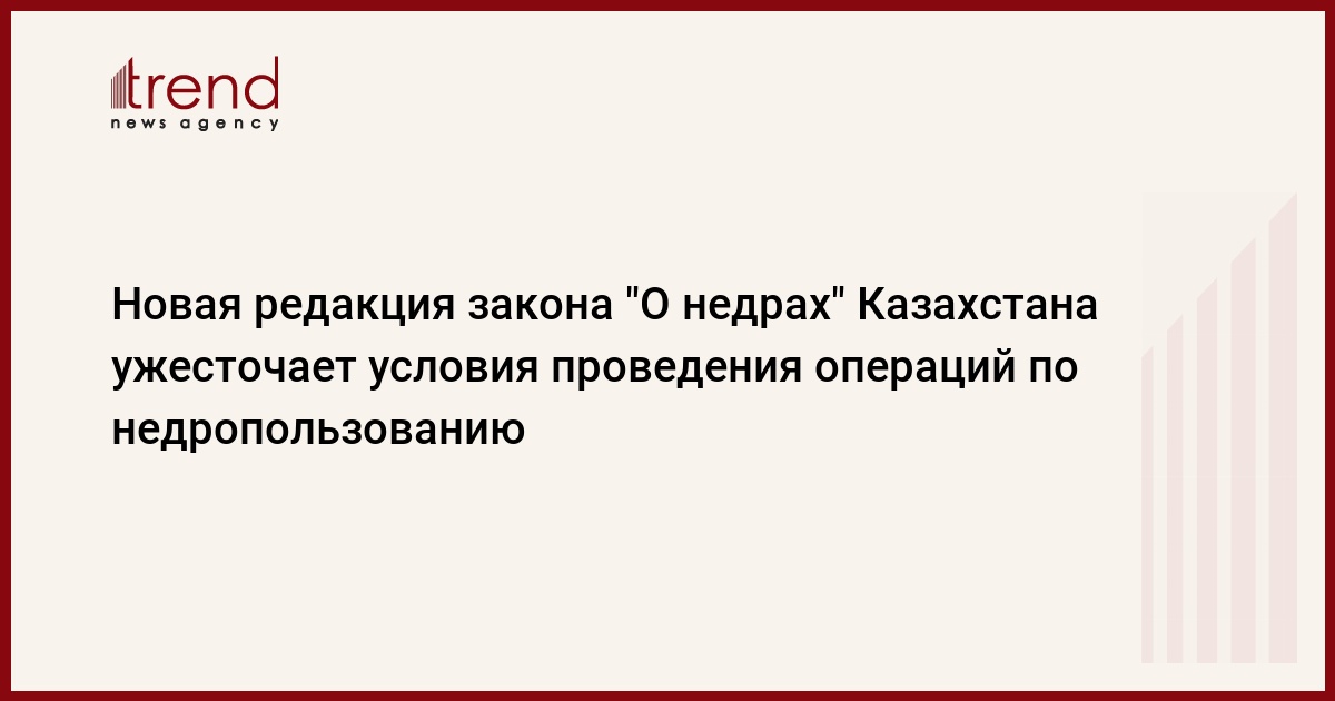 Казахстан, Астана, 16 сентября /корр. Trend К.Конырова/ Новая редакция закона "О недрах и недропользовании" Казахстана ужесточает условия проведения операций по недропользованию, об этом Trend на условиях анонимности заявил юрист одной из нефтяных компаний, работающих в Казахстане.