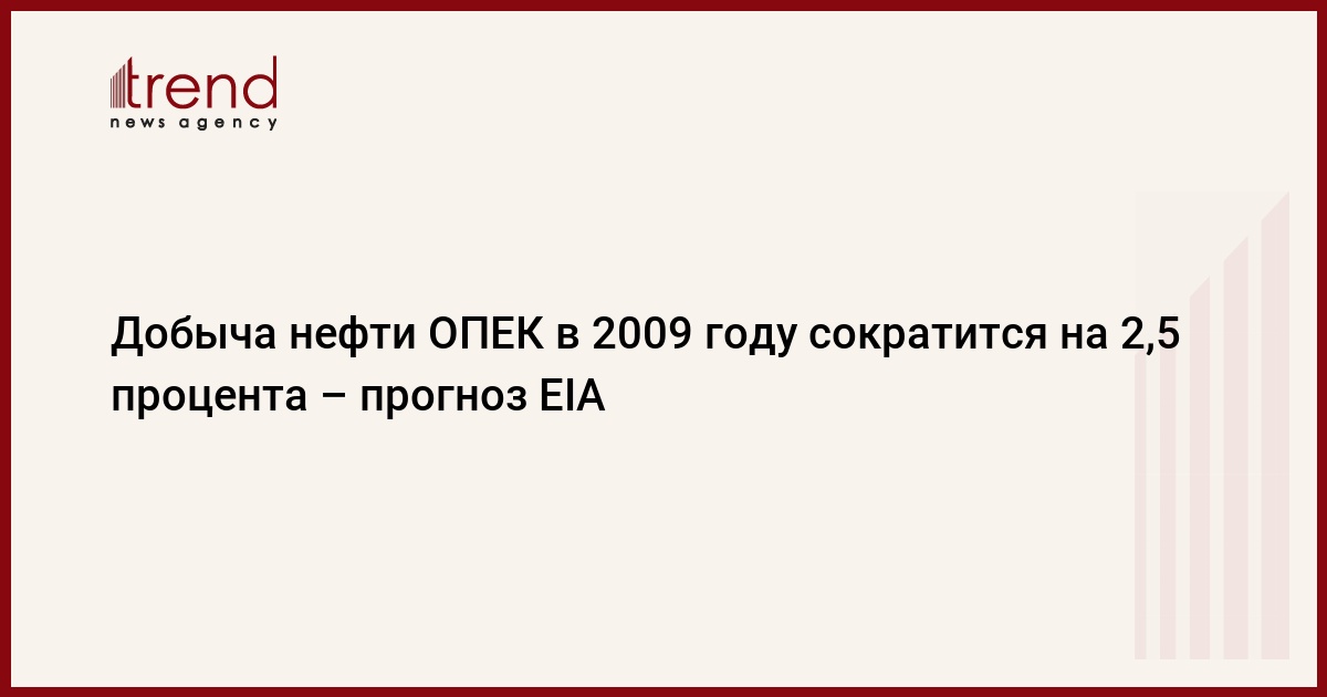 Азербайджан, Баку, 8 октября /корр. Trend А.Бадалова/ По прогнозам Государственного управления энергетической информации США (EIA), добыча нефти Организацией стран - экспортеров этого сырья (ОПЕК) в 2009 году сократится на 0,79 млн. баррелей в сутки - до 31,59 млн. баррелей.