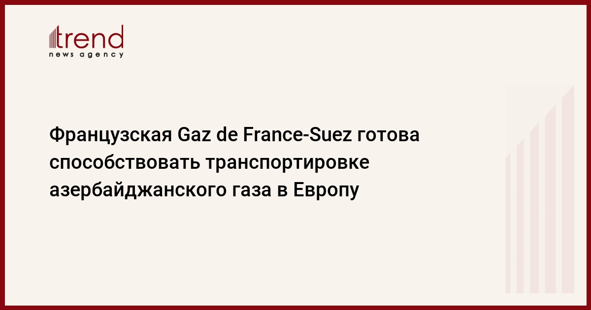 Азербайджан, Баку, 4 декабря / Trend / Крупнейшая французская энергетическая компания Gaz de France-Suez готова осуществлять поддержку транспортировке азербайджанского газа в Европу, сказал исполнительный вице-президент французской компании Жан-Мари Дожени на встрече с президентом SOCAR Ровнагом Абдуллаевым в Баку.
