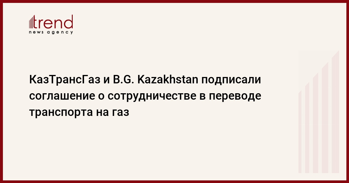Сегодня состоялось подписание соглашения о сотрудничестве между АО "КазТрансГаз" (дочерняя компания АО "НК "КазМунайГаз") и компанией "B.G. Kazakhstan" по реализации пилотного проекта по переводу автомобильного транспорта Алматы на компримированный природный газ, сообщает пресс-служба "КазТрансГаза"