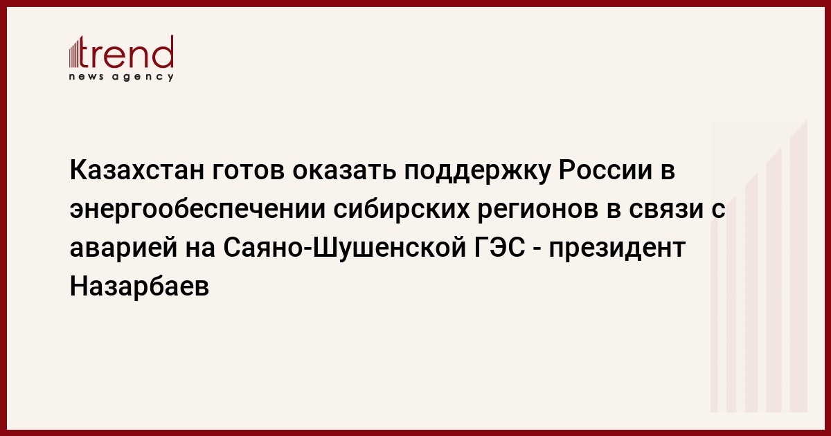 Казахстан готов оказать поддержку России в энергообеспечении сибирских регионов в связи с аварией на Саяно-Шушенской ГЭС, заявил глава государства Нурсултан Назарбаев, пишет РИА Новости.