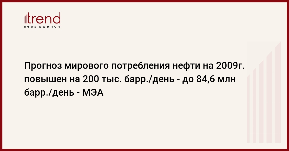 Прогноз Международного энергетического агентства (МЭА) относительно мирового потребления нефти в 2009г. повышен на 200 тыс. барр./день, сообщается в докладе МЭА, опубликованном сегодня в Париже. Так, потребление нефти мировой экономикой в 2009г. составит 84,6 млн барр./день, а не 84,4 млн барр./день, как это предполагалось месяцем ранее, пишет РБК.