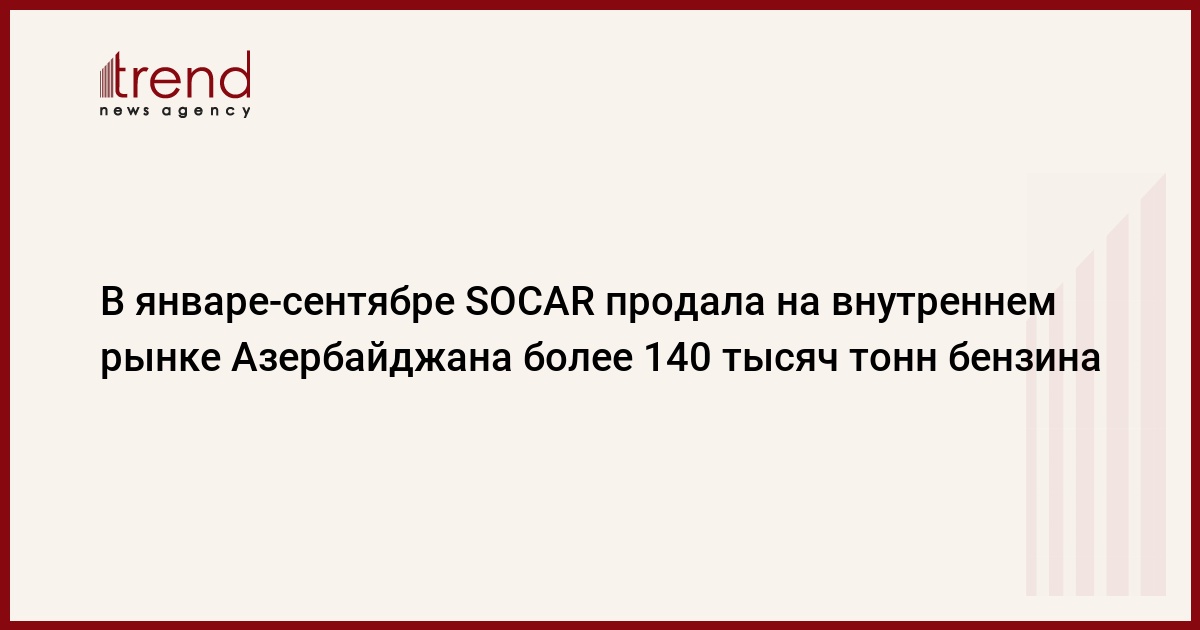 В январе-сентябре компанией SOCAR (Госнефтекомпания Азербайджана) на внутреннем рынке Азербайджана было реализовано более 433,3 тысячи тонн основных видов нефтепродуктов, говорится в сообщении Управления маркетинга и экономических операций компании SOCAR.