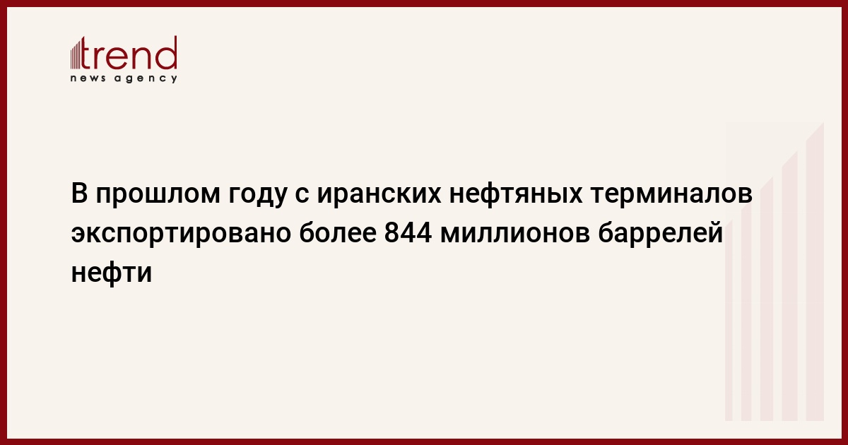 В прошлом году (в Иране новый год начинается 21 марта) с нефтяных терминалов Ирана было экспортировано 844 миллиона 210 тысяч 304 барреля сырой нефти различного сорта, сказал исполнительный директор иранской компании по управлению нефтяными терминалами Мухамедрза Муваххиди. Информация распространена иранским информационным агентством İRNA.