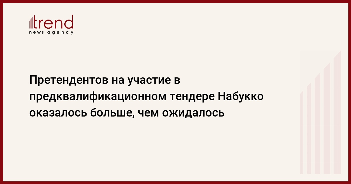 О начале предквалификационного тендера на поставку товаров длительного пользования (трубы, трубопроводная арматура) для строительства газопровода Набукко было объявлено консорциумом в апреле. Общая стоимость тендерного пакета - 3,5 миллиардов евро. Прием заявок завершен 17 мая.