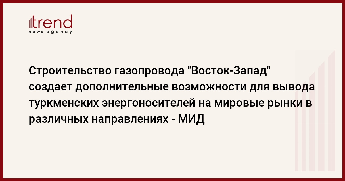 Строительство газопровода "Восток-Запад" создает дополнительные широкие возможности для обеспечения газом потребителей в Туркменистане, а также для вывода туркменских энергоносителей на мировые рынки в различных направлениях, говорится в сообщении министерства иностранных дел Туркменистана, распространенном во вторник.