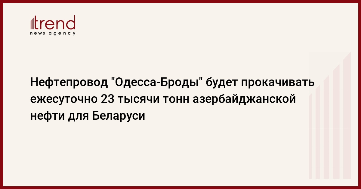 Нефтепровод "Одесса-Броды" будет прокачивать ежесуточно 23 тысячи тонн азербайджанской нефти для Беларуси, сообщает белорусское агентство БЕЛТА со ссылкой на слова пресс-секретаря ЗАО "Белорусская нефтяная компания" Андрея Синицы.