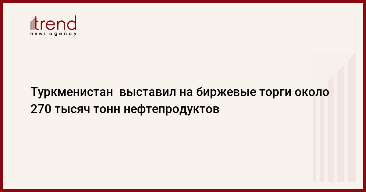 Туркменистан выставил в пятницу на торги на Государственной товарно-сырьевой бирже около 270 тысяч тонн готовой продукции производства двух нефтеперерабатывающих заводов (НПЗ) в городе Туркменбаши и городе Сейди и газоперерабатывающего комплекса в местности Наип.