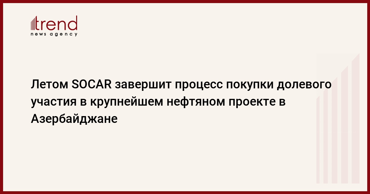 В июне-июле компания SOCAR (Госнефтекомпания Азербайджана) планирует завершить процедуру покупки более 1,6 процента долевого участия в проекте "Азери-Чираг-Гюнешли", сказал в четверг президент компании SOCAR Ровнаг Абдуллаев.