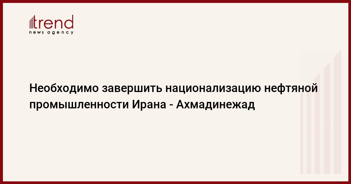 Нынешней миссией иранского народа является завершение национализации нефтяной промышленности, сказал во вторник президент Ирана Махмуд Ахмадинежад, сообщает информагентство IRNA.
