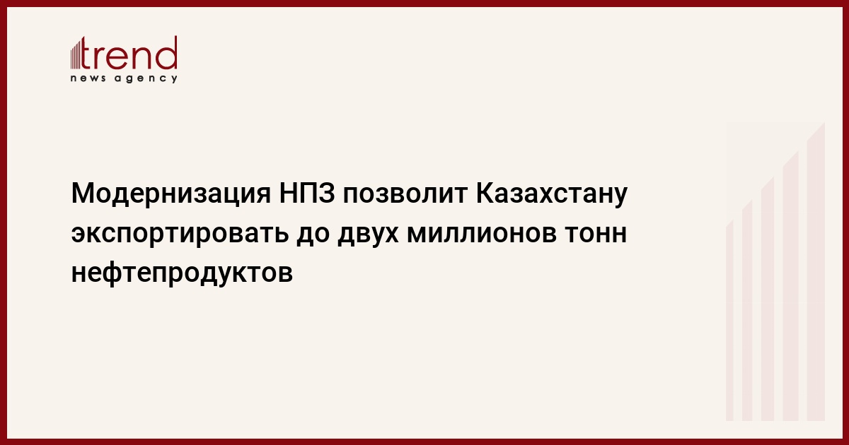 Модернизация трех существующих НПЗ позволит Казахстану экспортировать до двух миллионов тонн нефтепродуктов, сказал в понедельник на VI Каспийской нефтегазовой торгово-транспортной конференции в Баку коммерческий директор казахстанской национальной компании "КазМунайГаз Переработка Маркетинг" Азамат Акишев.