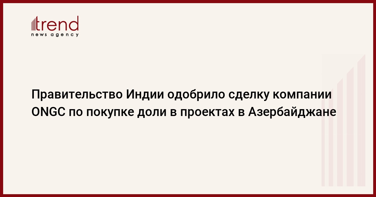 Федеральный кабинет Индии одобрил в четверг сделку компании ONGC Videsh Ltd по покупке доли в проектах в Азербайджане, которая оценивается в один миллиард долларов, сообщает Dow Jones со ссылкой на министра информации и вещания Индии Маниша Тевари.