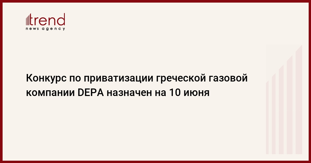 Конкурс по приватизации греческой газовой компании DEPA состоится 10 июня, сообщила представитель греческого агентства по приватизации (HRADF) Мария Цинариду в понедельник российским журналистам, пишет РИА Новости.