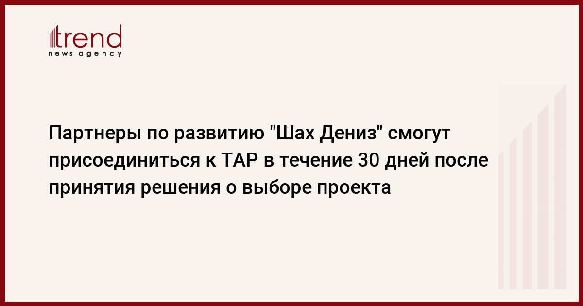 Партнеры по разработке азербайджанского газового месторождения "Шах Дениз" могут присоединиться к проекту Трансадриатического трубопровода (TAP) в течение 30 дней после принятия решения о выборе проекта в качестве маршрута для транспортировки газа с "Шах Дениз-2" в Европу, сообщил Trend в четверг источник в TAP.
