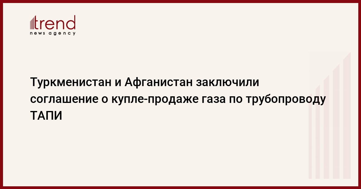 Национальные газовые компании Туркменистана и Афганистана накануне заключили соглашение о купле-продаже природного газа, который будет поставляться из Туркменистана в Афганистан по газопроводу "Туркменистан-Афганистан-Пакистан-Индия" (ТАПИ), говорится в пресс-релизе МИД Туркменистана, распространенном посольством республики в Азербайджане в среду.