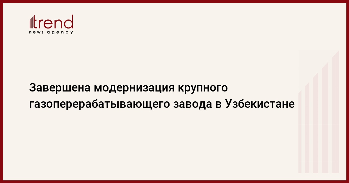 Национальная холдинговая компания (НХК) "Узбекнефтегаз" завершила модернизацию УДП "Мубарекский газоперерабатывающий завод" в Кашкадарьинской области на юге страны стоимостью 171,8 миллиона долларов, говоритя в совместном сообщении министерства экономики и Государственного комитета по статистике Узбекистана.