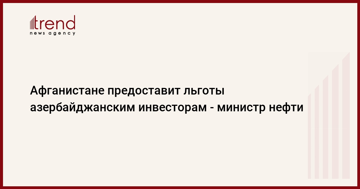 Правительство Афганистана готово предоставить льготы и создать необходимые условия азербайджанским инвесторам в различных сферах, в том числе в добывающей, нефтегазовой и др. Об этом в среду в интервью Trend сказал министр нефти и промыслов Афганистана Вахидуллах Шахрани.