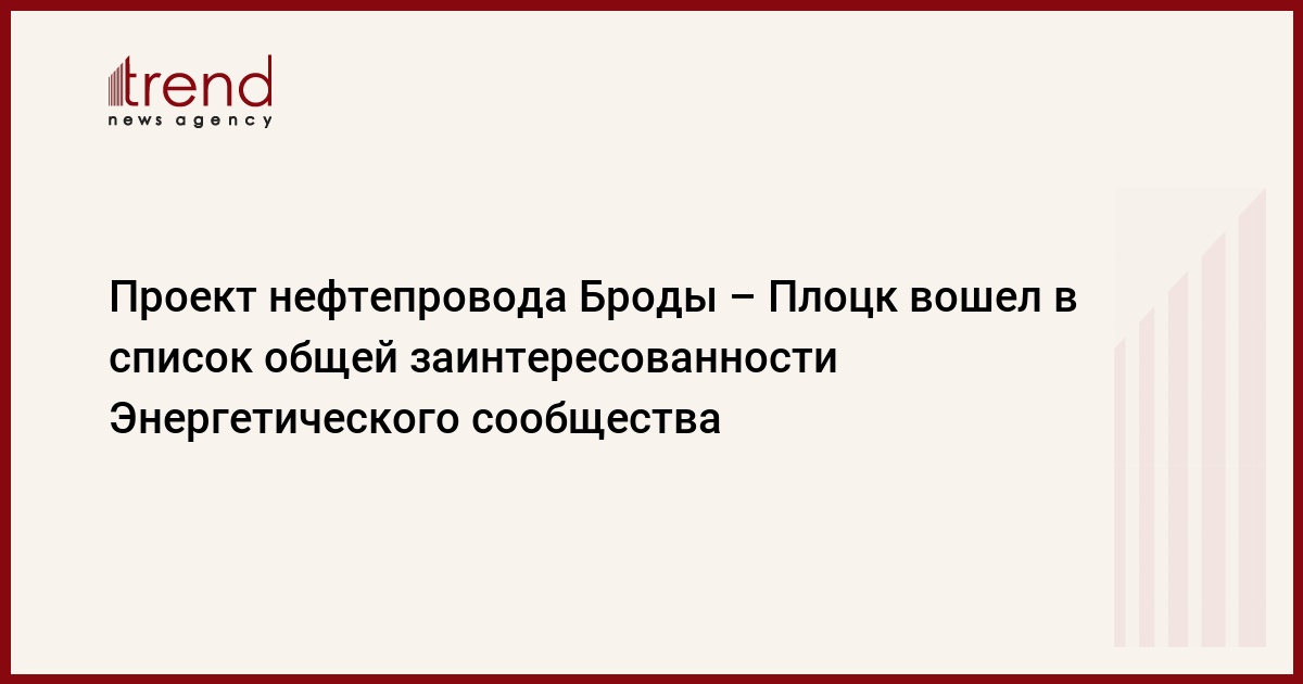 Проект строительства нефтепровода Броды - Плоцк (Адамова застава) утвержден в списке проектов общей заинтересованности Энергетического сообщества (PECI), говорится в сообщении, размещенном в среду на официальном сайте Международного трубопроводного предприятия "Сарматиа".