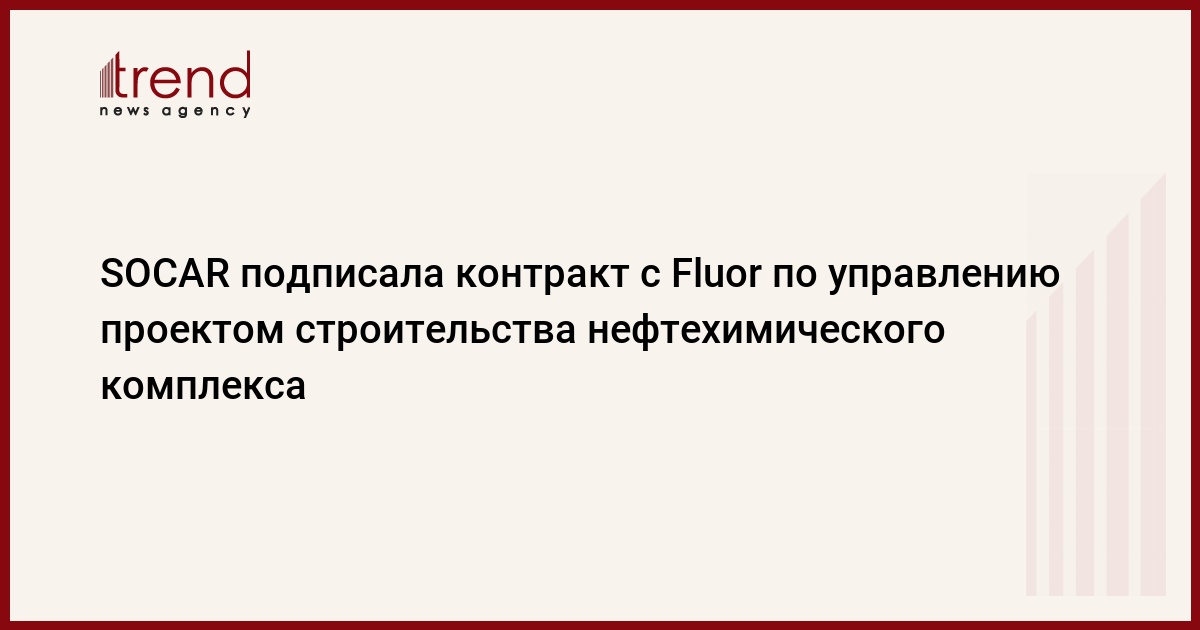 БАКУ /Trend/ - Компания SOCAR (Госнефтекомпания Азербайджана) подписала контракт с американской Fluor Limited, согласно которому Fluor стала подрядчиком на оказание услуг по управлению реализацией проекта создания нового нефтехимического комплекса (OGPC) в Азербайджане.