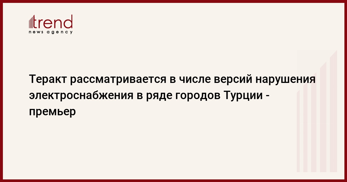 БАКУ /Trend/ - В качестве одной из версий нарушения электроснабжения в около 30 городах Турции может быть рассмотрен и теракт. Об этом сказал премьер-министр Турции Ахмед Давутоглу, передает во вторник телеканал TRT Haber.