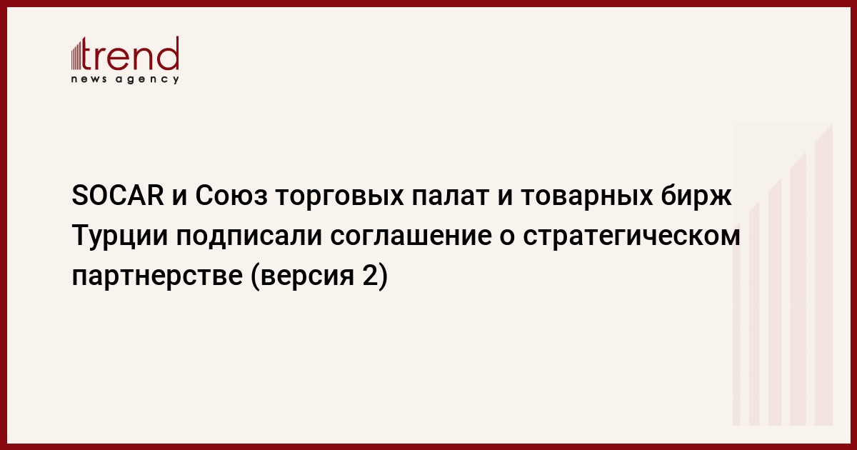 БАКУ /Trend/ - Компания SOCAR (Госнефтекомпания Азербайджана) и Союз торговых палат и товарных бирж Турции подписали во вторник в Баку соглашение о стратегическом партнерстве.