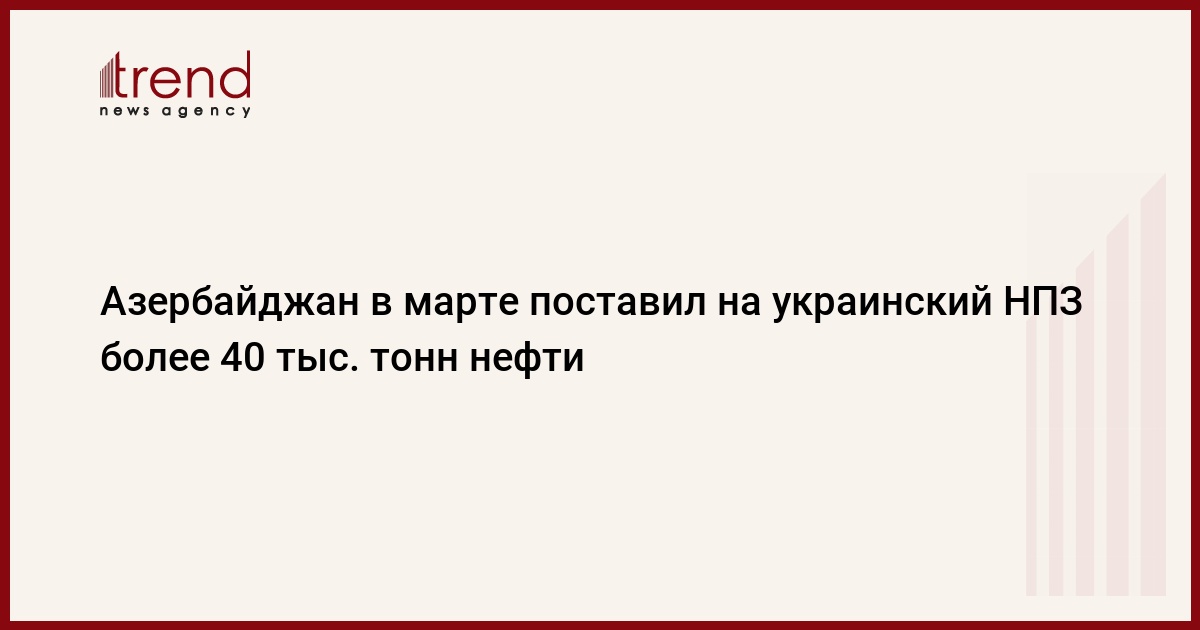 БАКУ /Trend/ - Объем транспортировки нефти сорта Azeri Light на Кременчугский НПЗ в Украине в марте составил 43,32 тысячи тонн, говорится в сообщении, размещенном на сайте ПАО "Укртранснафта" (оператор нефтетранспортной системы Украины).