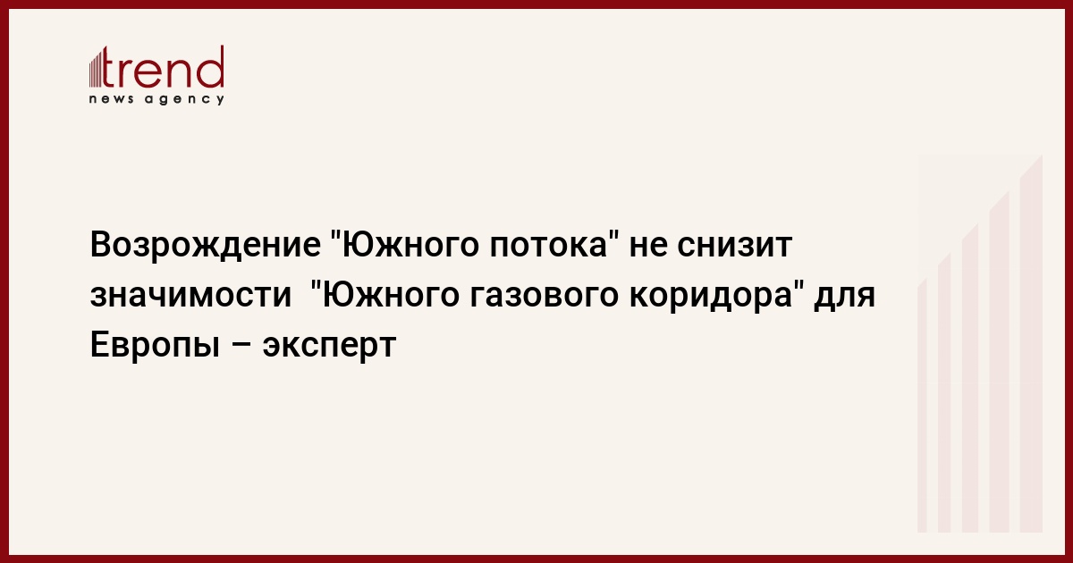 БАКУ /Trend/ - Возрождение проекта "Южный поток", предполагающего поставки в Европу российского газа, не снизит значимости проекта «Южный газовый коридор» для Европы, считает генеральный директор кипрской консалтинговой компании в области энергетики e-CNHC с более чем тридцатипятилетним опытом работы в нефтегазовом секторе Чарльз Эллинас.