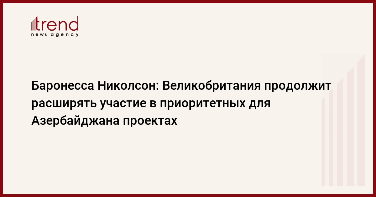"Мы готовы оказать Азербайджану поддержку в диверсификации экономики, являющейся важным фактором в развитии страны. Наши планы по дальнейшему сотрудничеству включают проекты в таких сферах, как образование, здравоохранение, сельское хозяйство и другие", - сказала Николсон.