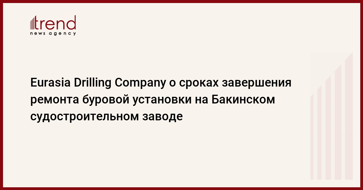 БАКУ /Trend/ - Ремонт буровой установки, принадлежащей независимой буровой компании Eurasia Drilling Company на Бакинском судостроительном заводе, будет завершен к октябрю, сообщили Trend в компании.