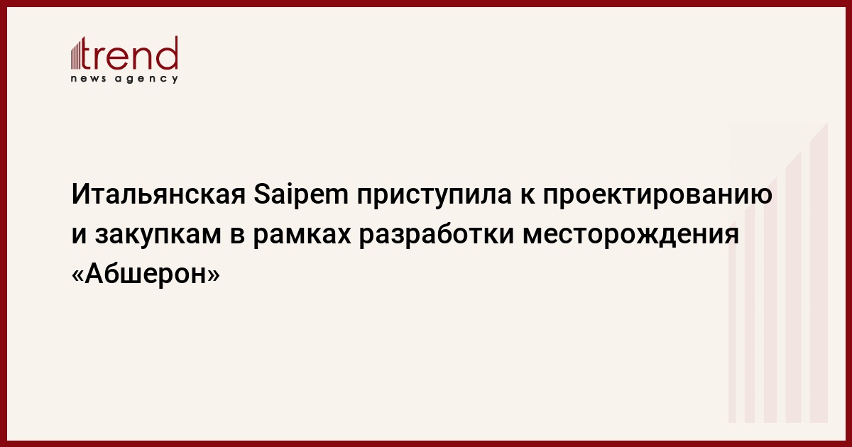 «Компания Saipem, в консорциуме с Bos-Shelf / Star Gulf, заключила контракт с Total E&P Absheron BV по проекту «Схема раннего производства» на месторождении «Абшерон». Этот контракт предусматривает работы по проектированию, закупкам, поставкам, изготовлению, установке и пусконаладочным работам до ввода в эксплуатацию поточной линии [комплекс оборудования, взаимосвязанного и работающего согласовано с заданным ритмом по единому технологическому процессу] и т.д. Сегодня начаты работы по проектированию и закупкам», - сказали в компании.