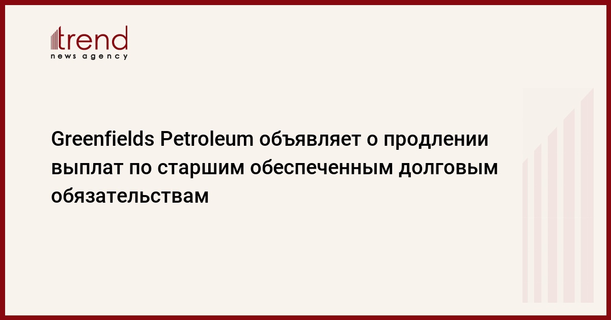 БАКУ /Trend/ - Американская компания Greenfields Petroleum Corporation, являющаяся оператором блока «Бахар-Гум Дениз» в Азербайджане посредством своей дочерней компании Bahar Energy Limited (BEL), объявила о продлении выплат по старшим обеспеченным долговым обязательствам, сообщает в четверг Trend со ссылкой на отчет компании.