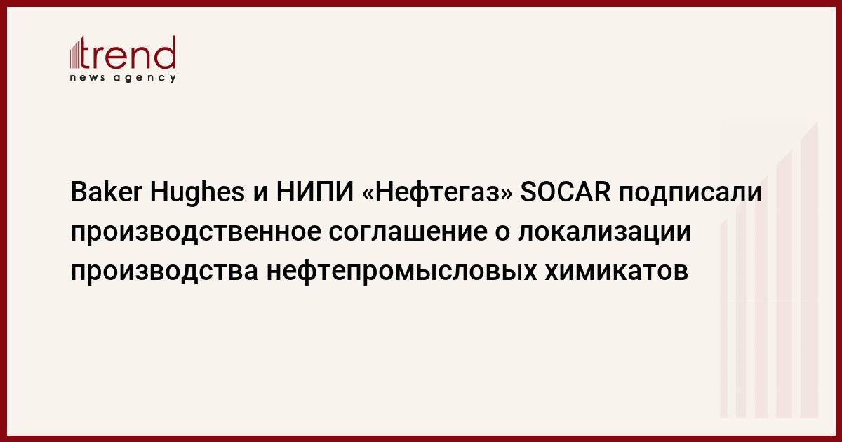 БАКУ /Trend/ - Baker Hughes и НИПИ «Нефтегаз» SOCAR подписали производственное соглашение о локализации производства нефтепромысловых химикатов, используя существующие ресурсы SOCAR в Азербайджане, сообщает Trend во вторник с конференции Energy Forward, организованной компанией Baker and Hughes.