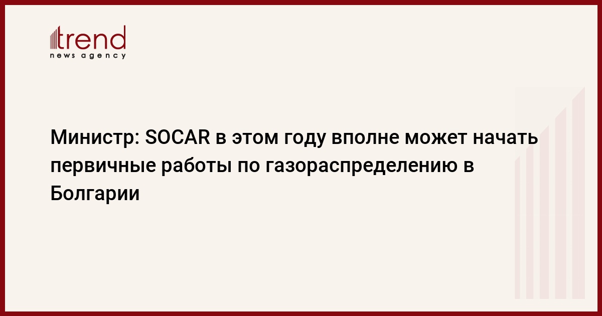 БАКУ/ Trend / - Государственная нефтяная компания Азербайджана SOCAR вполне может начать первичные работы по распределению газа в Болгарии в этом году, сказала Trend министр энергетики Болгарии Теменужка Петкова.