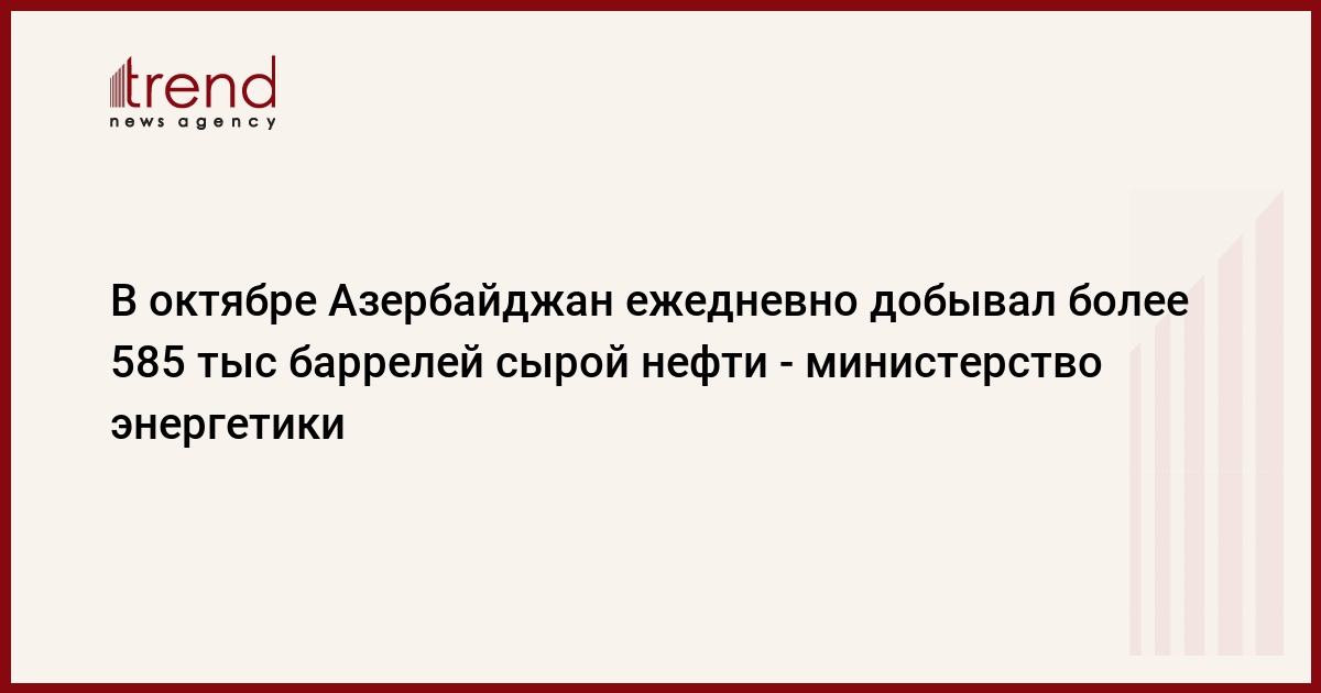БАКУ /Trend/ - В октябре 2020 года суточная добыча нефти (вместе с конденсатом) в Азербайджане составила 675,2 тысяч баррелей, сообщает Trend со ссылкой на министерство энергетики Азербайджана.