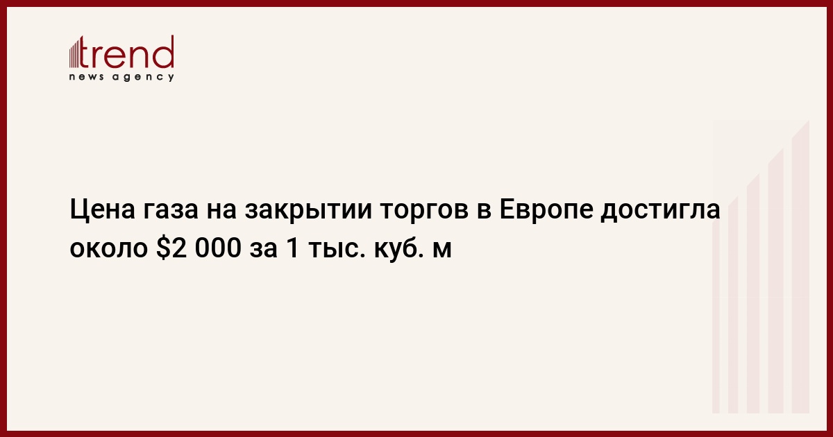 Цена газа в Европе закончила суточные торги на бирже в среду на уровне около $2 000 за 1 тыс. куб. м после того, как днем побила исторический рекорд, достигнув колоссальных $2 226, свидетельствуют данные лондонской биржи ICE, передает Trend со ссылкой на ТАСС.