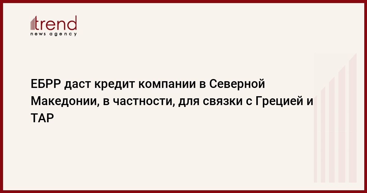 БАКУ/Trend/ - Европейский банк реконструкции и развития (ЕБРР) рассматривает возможность предоставления северо-македонской компании "NOMAGAS" гарантированного государством долгосрочного кредита на сумму до 98,59 миллиона евро для строительства участков трубопроводов для поставок газа и водорода в Северную Македонию, передает во вторник Trend со ссылкой на информацию на сайте ЕБРР.