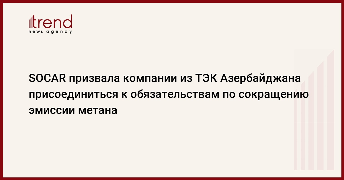 БАКУ /Trend/ - Государственная нефтяная компания Азербайджана (SOCAR) призывает все компании, работающие в нефтегазовом секторе Азербайджана, присоединиться к обязательствам по сокращению выбросов метана с тем, чтобы к 2050 году нефтегазовый сектор страны достиг нулевых выбросов метана.