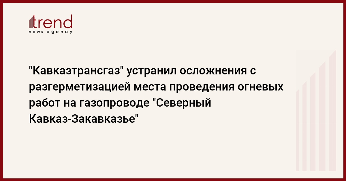 ООО "Кавказтрансгаз" продолжает ремонтно-восстановительные работы на магистральном газопроводе "Северный Кавказ Закавказье". Как передает Trend , в распространенном пресс-релизе ООО "Кавказтрансгаз" говорится, что устранены последствия осложнений, связанных с разгерметизацией места проведения огневых работ. В документе отмечается, что поступление остаточного конденсата в трубе с южной стороны прекращено. Вывезен грунт, загрязненный конденсатом. Завершены необходимые земляные работы.