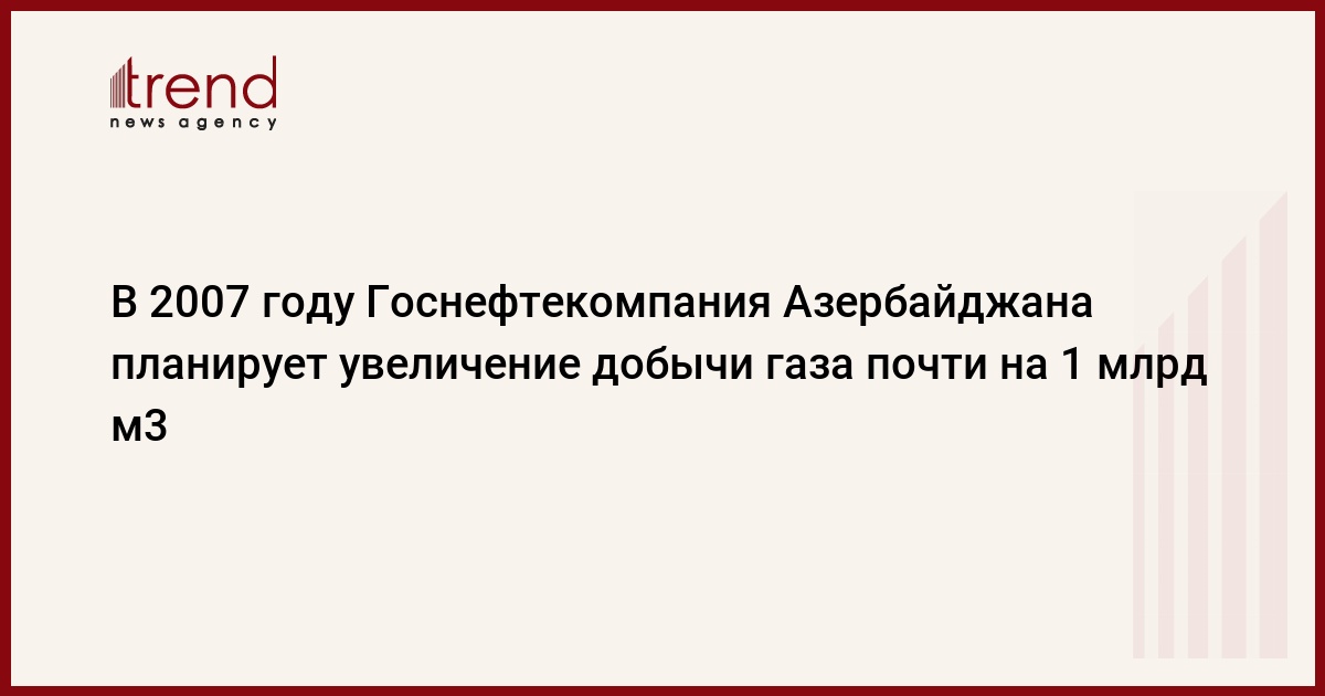 По прогнозам на 2007 год Государственная нефтяная компания Азербайджана (ГHКАР) намерена увеличить добычу газа на 2-2,5 млн. куб метров в сутки (порядка 900 млн.м3 в год), сообщили Trend в министерстве промышленности и энергетики Азербайджана.