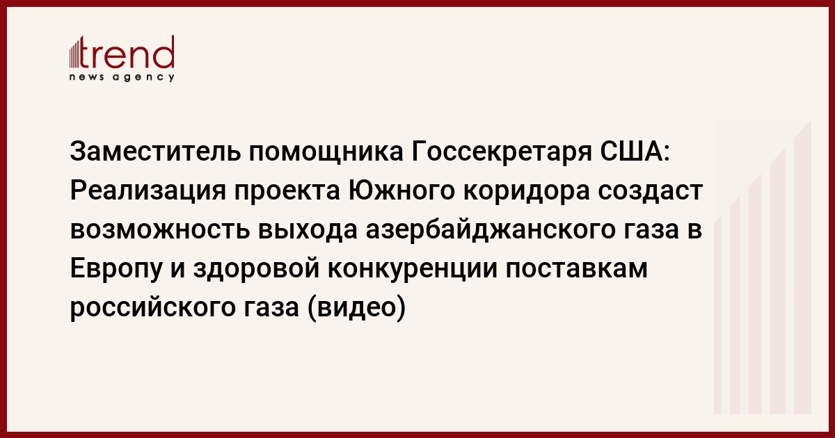 Азербайджан, Баку / Trend / Реализация проекта Южного коридора поставок газа создаст возможность для выхода азербайджанского газа в Европу и здоровой конкуренции поставкам российского газа в европейские страны, заявил в четверг в Баку заместитель помощника Госсекретаря США Мэтью Брайза.