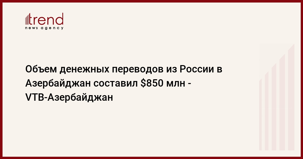БАКУ /Trend/ - Совокупный размер денежных переводов из России в Азербайджан за 2019 год составил 850 миллионов долларов, сказал на пресс-конференции председатель правления банка VTB-Азербайджан Евгений Кирин, сообщает в четверг Trend.