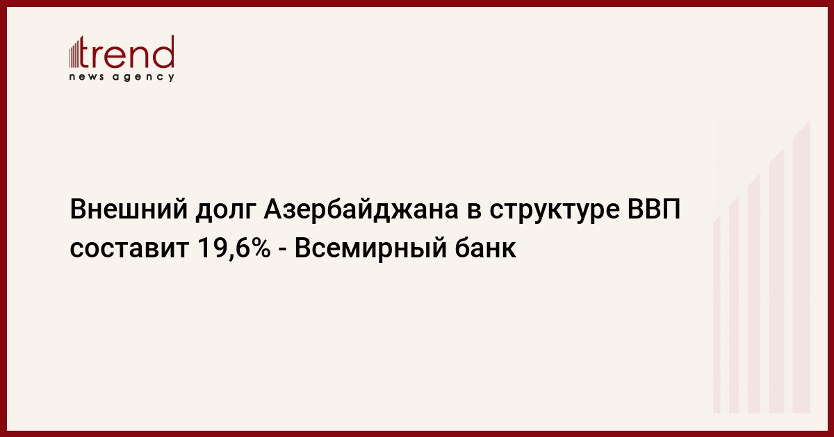 БАКУ /Trend/ - По прогнозам Всемирного банка, соотношение внешнего долга Азербайджана к ВВП в текущем году составит 19,6 процента, что на 0,7 процентных пункта больше прогноза на 2019 год сообщает Trend со ссылкой на обновленный отчет Всемирного банка по Европе и Центральной Азии.