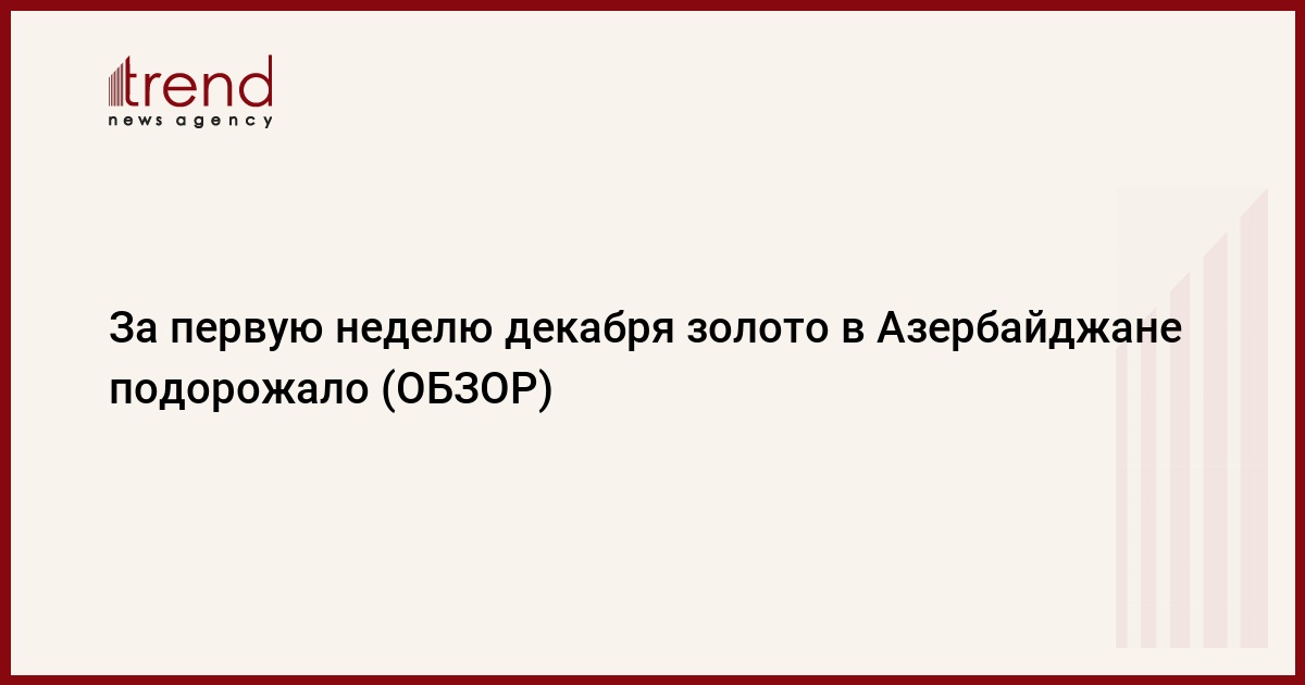 БАКУ /Trend/ - На первой неделе декабря унция золота в Азербайджане подорожала на 122,82 маната (4,1 процента). Средневзвешенная стоимость унции золота составила 3075,496 манатов, что на 0,8 процентов меньше, чем на прошлой неделе.