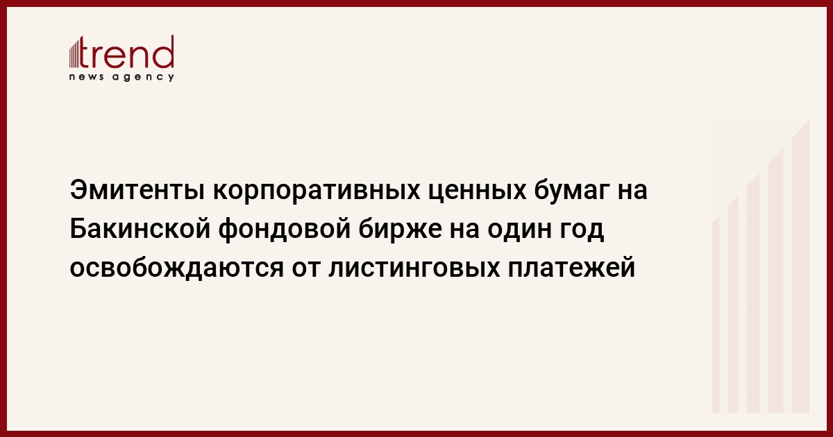 Как сообщает в понедельник Trend со ссылкой на отчетные данные биржи, эмитенты корпоративных ценных бумаг, включенных в листинг с 1 января 2021 года по 1 июля 2021 года, будут освобождены от листинговых платежей сроком на один год с даты их включения в листинг.