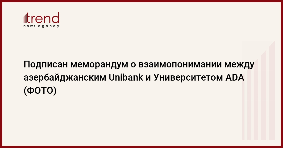 БАКУ /Trend/ - 15 марта был подписан меморандум о взаимопонимании между азербайджанским Unibank и Университетом АDА, сообщает Trend во вторник со ссылкой на банк.
