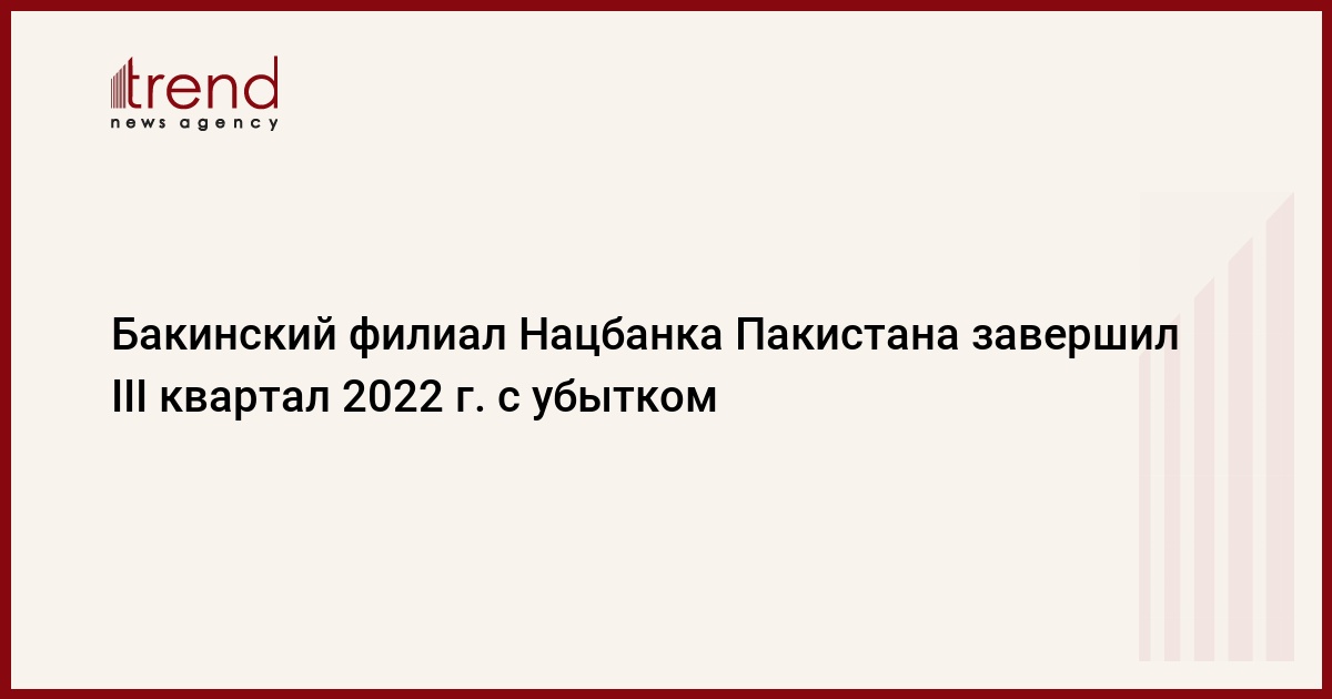 БАКУ /Trend/ - Чистый убыток бакинского филиала Национального банка Пакистана по итогам третьего квартала 2022 года составил 349,48 тысячи манатов, сообщает в среду Trend со ссылкой на финансовый отчет банка.