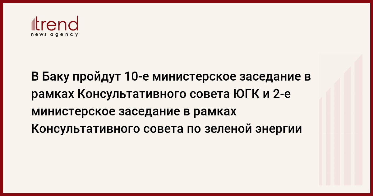 БАКУ /Trend/ - 1 марта в столице Азербайджана состоятся 10-е министерское заседание в рамках Консультативного совета Южного газового коридора (ЮГК) и 2-е министерское заседание в рамках Консультативного совета по зеленой энергии.