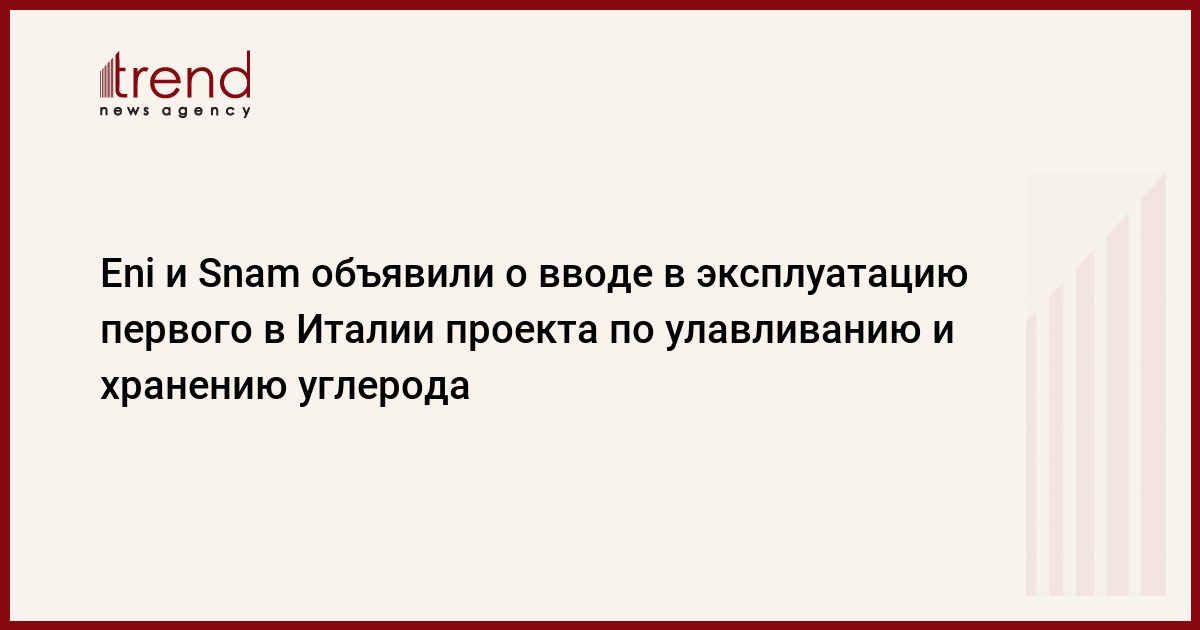 БАКУ/Trend/ - Итальянские Eni и Snam 6 сентября объявили о вводе в эксплуатацию первого в Италии проекта по улавливанию и хранению углерода (CCS/ CCUS) - "Ravenna CCS", передает в пятницу Trend со ссылкой на пресс-службу Eni.